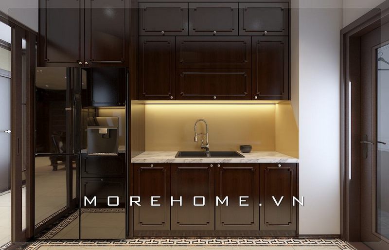 Mẫu tủ bếp gỗ tự nhiên cao cấp được Morehome hoàn thiện.
