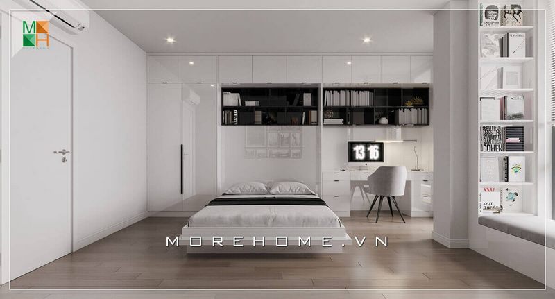 Không gian phòng ngủ được thiết kế theo phong cách thể thao, chiếc giường bằng gỗ công nghiệp vuông vắn hiện đại với gam màu trắng ưa nhìn.