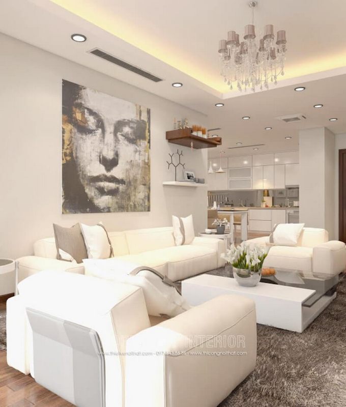 Trang trí không gian phòng khách căn hộ chung cư đẹp, sang trọng bởi ý tưởng thiết kế nội thất đương đại kết hợp gam màu trắng nhẹ nhàng, thanh lịch.
