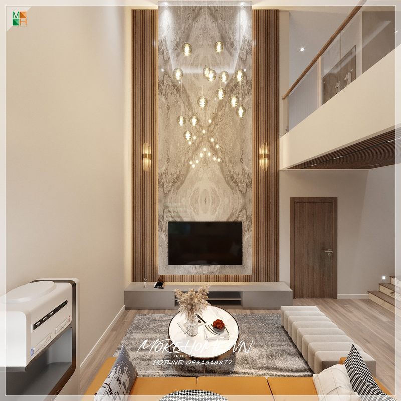 Bức vách tivi được ốp đá vân mây vàng mang đến sự sang trọng tuyệt đối cho phòng khách