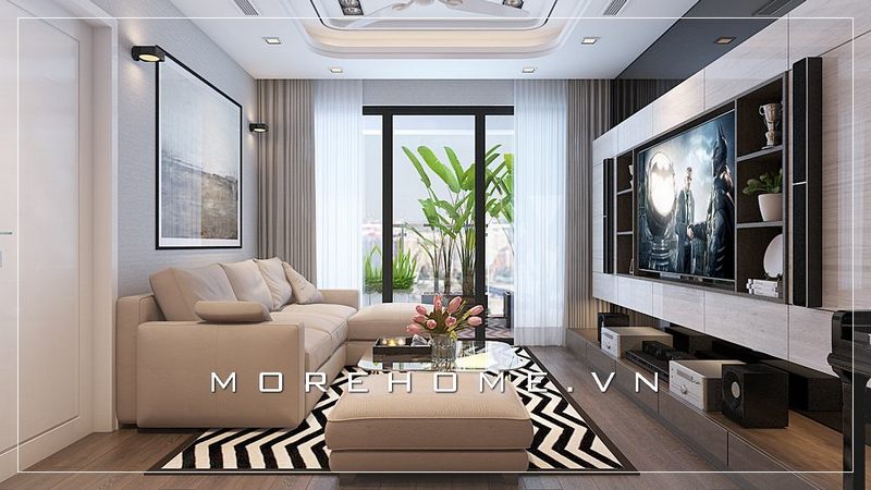 Trang trí nội thất phòng khách hiện đại ấn tượng với sofa văng, thảm trải sàn cho căn hộ chung cư.