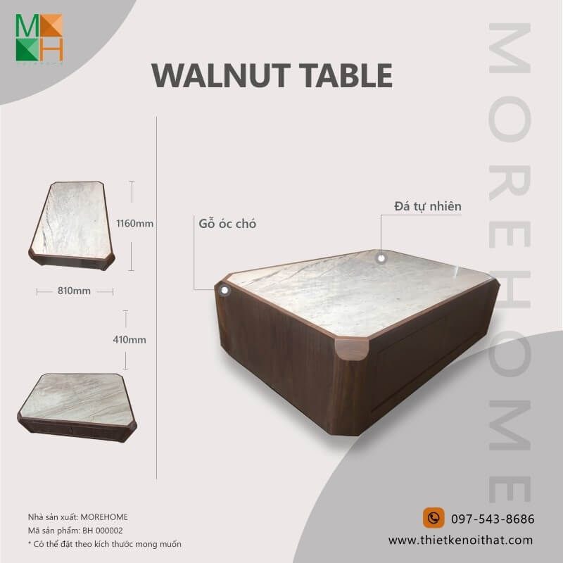 Mẫu bàn trà bằng gỗ óc chó cao cấp kết hợp mặt bàn đá nhân tạo vân mây kiểu dáng hình hộp không chân lạ mắt, phù hợp với phòng khách theo phong cách hiện đại