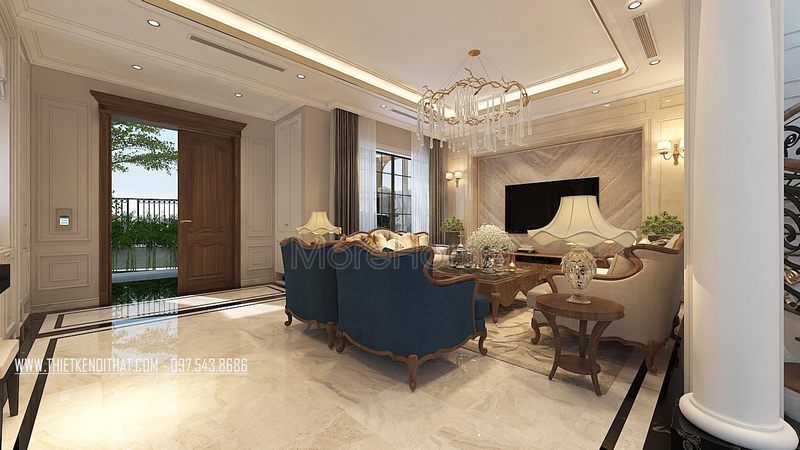 Gợi ý cho bạn mẫu thiết kế nội thất phòng khách biệt thự mang phong cách tân cổ điển cao cấp, quý phái.