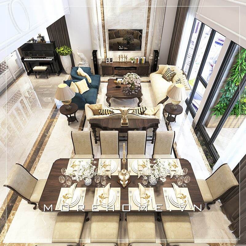 Trang trí phòng ăn liền phòng khách theo phong cách tân cổ điển cho một không gian sống cao cấp tiện nghi phù hợp với biệt thự