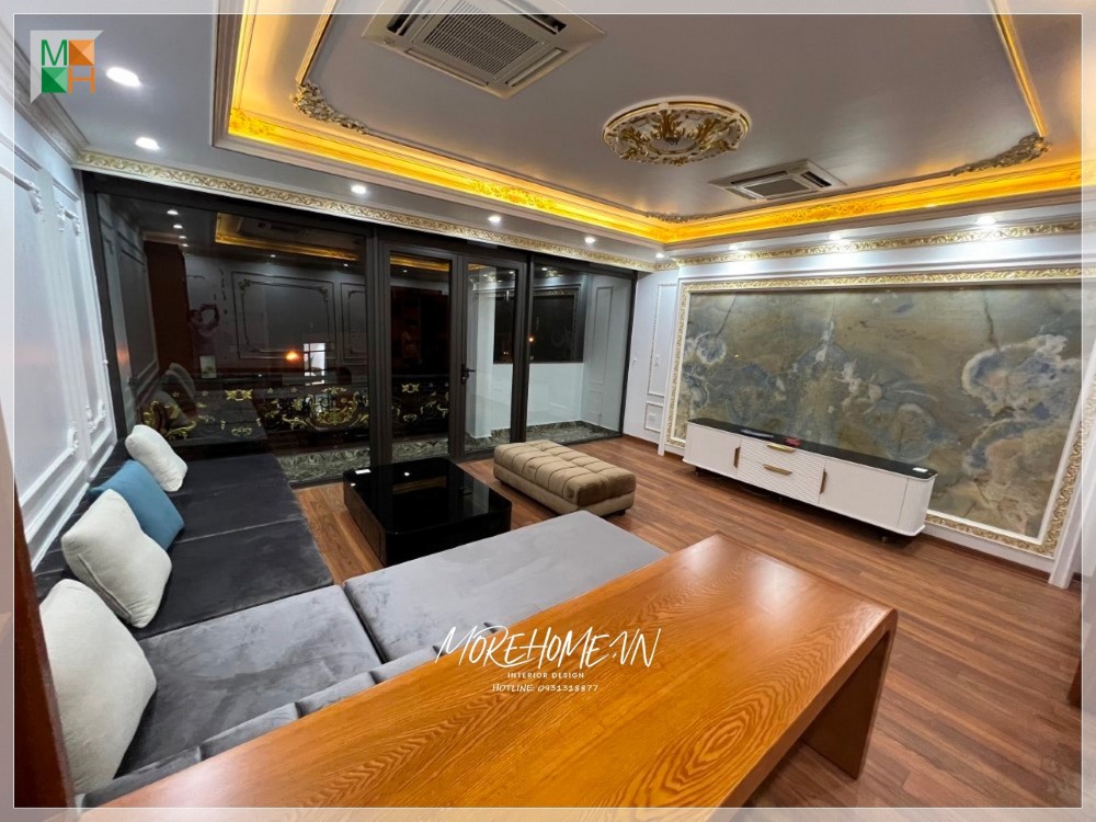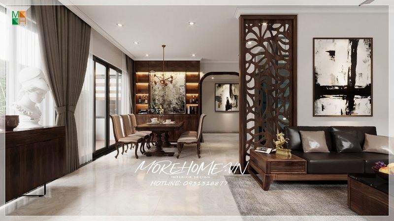 Thiết kế nội thất phòng khách chung cư Mandarin đẹp với phong cách tân cổ điển cùng đồ nội thất gỗ tự nhiên cao cấp.