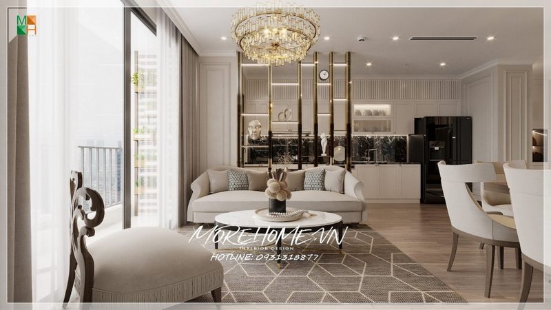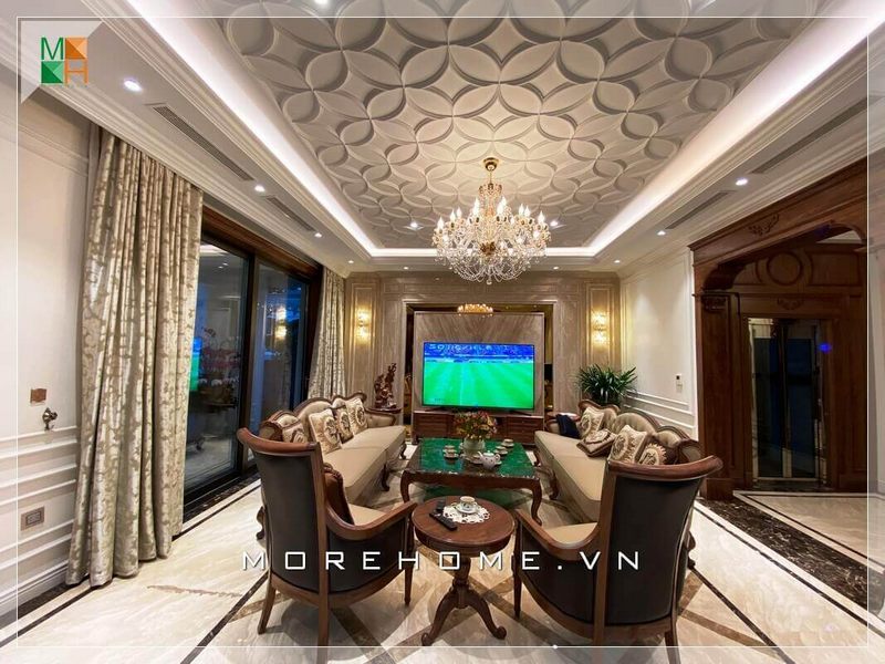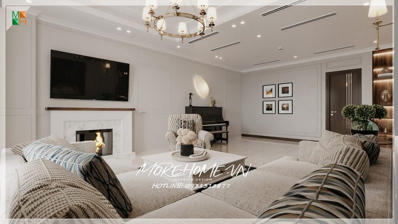 Thiết kế nội thất phòng khách chung cư cao cấp phong cách tân cổ điển sang trọng với từng đường nét, họa tiết vô cùng độc đáo