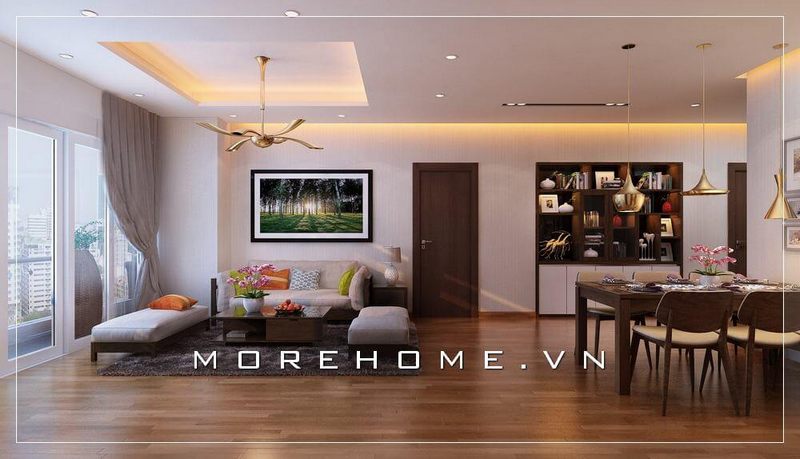 Mẫu trang trí nội thất phòng khách biệt thự đẹp sang trọng cao cấp nổi bật với chất liệu gỗ công nghiệp An Cường, bộ sofa góc nâu cùng chiếc bàn khối vuông lạ mắt.