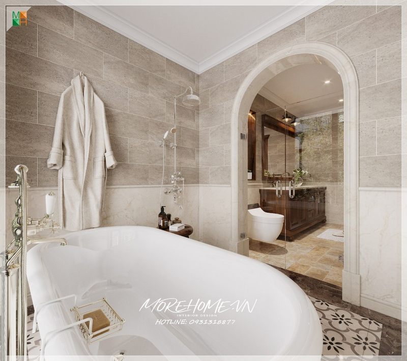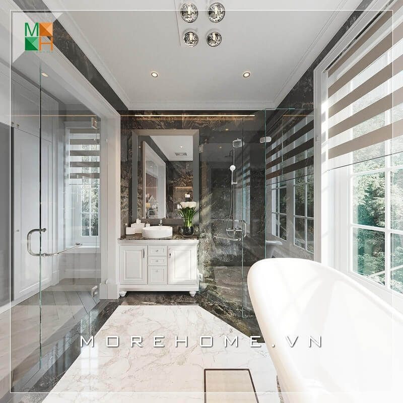 Không gian phòng tắm rộng của biệt thự, nhà phố được thêm sự hiện đại và tiện nghi bởi sự sử dụng của hệ thống kính ngăn hiện đại.