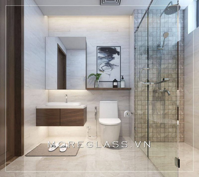 Mẫu thiết kế phòng tắm đơn giản được kết hợp với kệ tủ và các thiết bị vệ sinh cao cấp, nhỏ gọn.