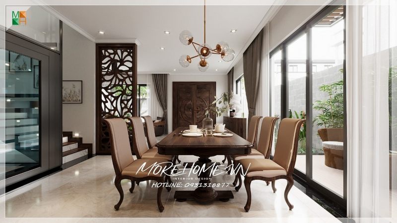 Mẫu bàn ăn bằng gỗ óc chó với chân bàn được thiết kế theo phong cách tân cổ điển sẽ làm cho phòng ăn trở nên sang trọng hơn.