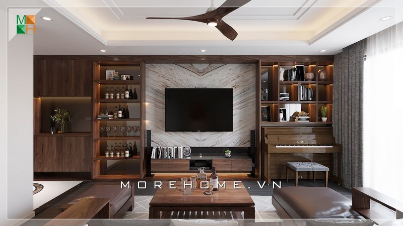 Phong cách hiện đại kết hợp với nội thất gỗ óc chó đẹp và sang trọng là lựa chọn tuyệt vời để tạo nên ấn tượng cho các không gian phòng khách rộng của căn hộ chung cư cao cấp.